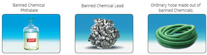 Most of the hoses available in market are produced from PVC along with DOP, a chemical substance that contains extremely toxic phthalate and heat stabilizers with traces of lead so as to add flexibility and resilience. It's really shocking to know that those chemicals which are banned in developed countries like America, Japan, Taiwan & Hong Kong are being used in India and China with out any benchmarks.